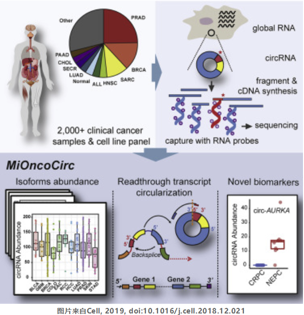 在一项新的研究中,来自美国密歇根大学的研究人员对多种癌症中的circRNA进行了编目,并进行了初步研究,表明这些稳定的结构可能作为血液或尿液中的癌症生物标志物。相关研究结果发表在2019年2月7日的Cell期刊上,论文标题为“The Landscape of Circular RNA in Cancer”。
