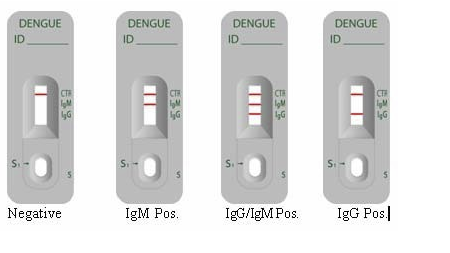 登革热NS1抗原快速检测卡是基于人血清中NS1抗原检测的免疫试验。试验区纤维膜上包被有NS1特异性抗体,还设置了独立的质控区,以确保试验的有效性。试验中,将样本直接加至样本加样区,然后将其放置在含有3滴缓冲液的贮存孔内,然后与胶体金结合的NS1特异性单抗反应,液体在纤维膜上移动(毛细血管作用)如果样本中存在抗原,试验区就会出现红色条带,如果试验操作正确,质控区也会出现红色条带,则表示试验有效