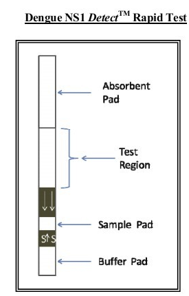 登革热NS1快速检测是基于人血清中NS1抗原检测的免疫试验。试验区纤维膜上包被有NS1特异性抗体,还设置了独立的质控区,以确保试验的有效性。试验中,将样本直接加至样本加样区,然后将其放置在含有3滴缓冲液的贮存孔内,样本与缓冲液混合,然后与胶体金结合的NS1特异性单抗反应,液体在纤维膜上移动(毛细血管作用),与纤维膜上包被的抗NS1抗体反应,如果样本中存在抗原,试验区就会出现红色条带,如果试验操作正确,质控区也会出现红色条带,则表示试验有效。
