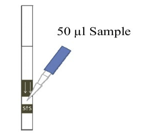 2. 样本底板上(sample pad )加50ul的试验样本,样本底板位置在箭头的之间,见下图。不要将样本加至缓冲液底板(buffer pad )